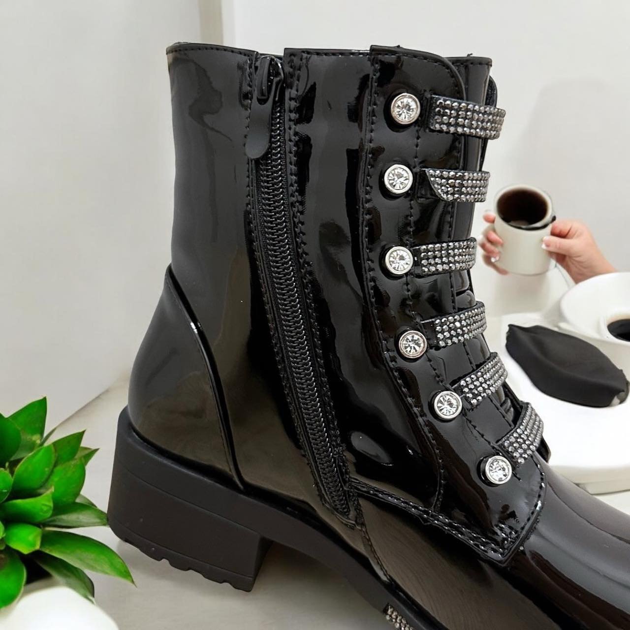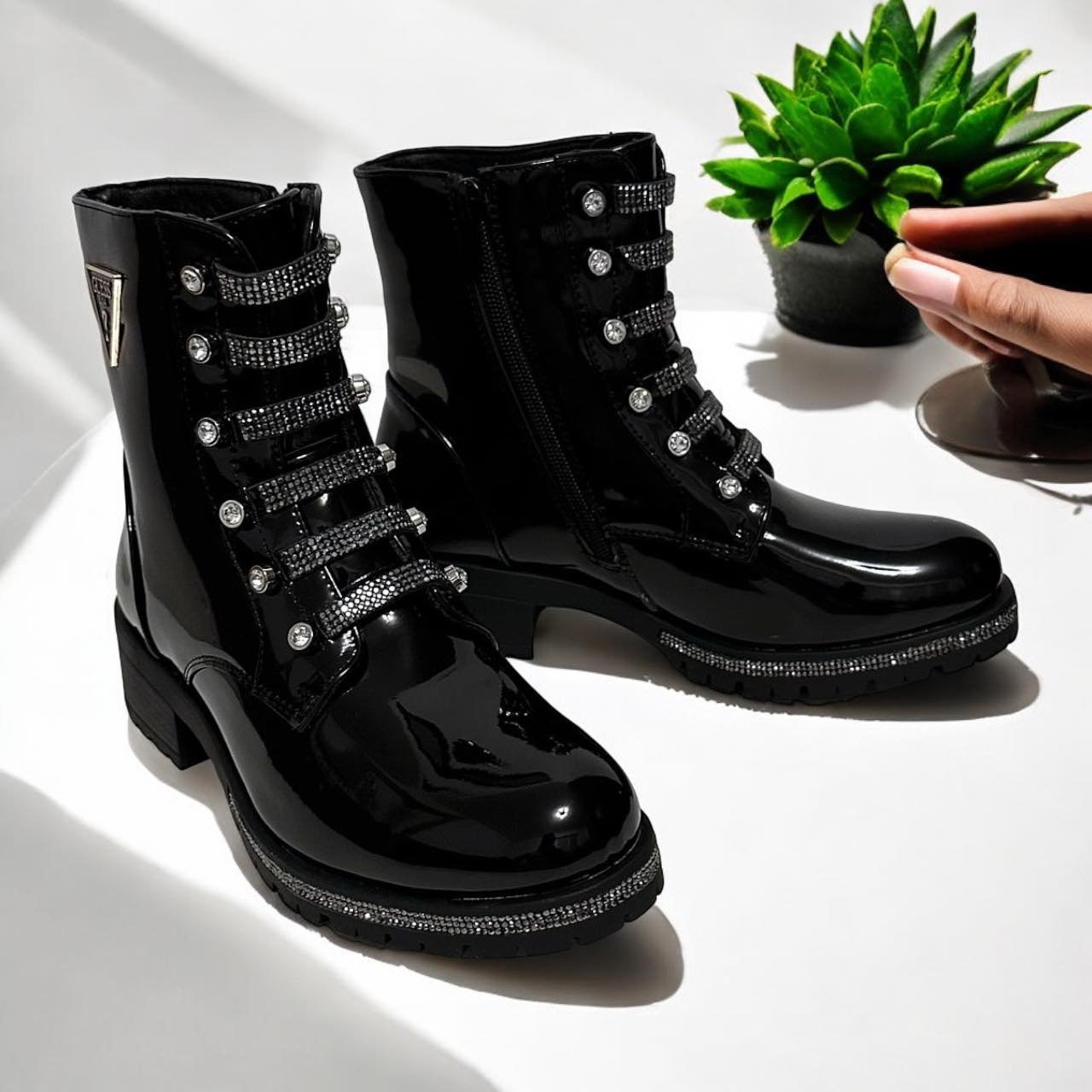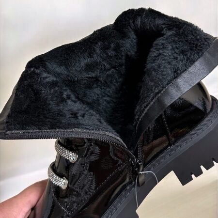 Botki damskie z eko skóry lakierowanej, z zamkiem i ozdobnym sznurowaniem i okrągłym noskiem , dodatkowo ocieplenie w formie futerka– nowoczesność, wygoda i styl w jednym.