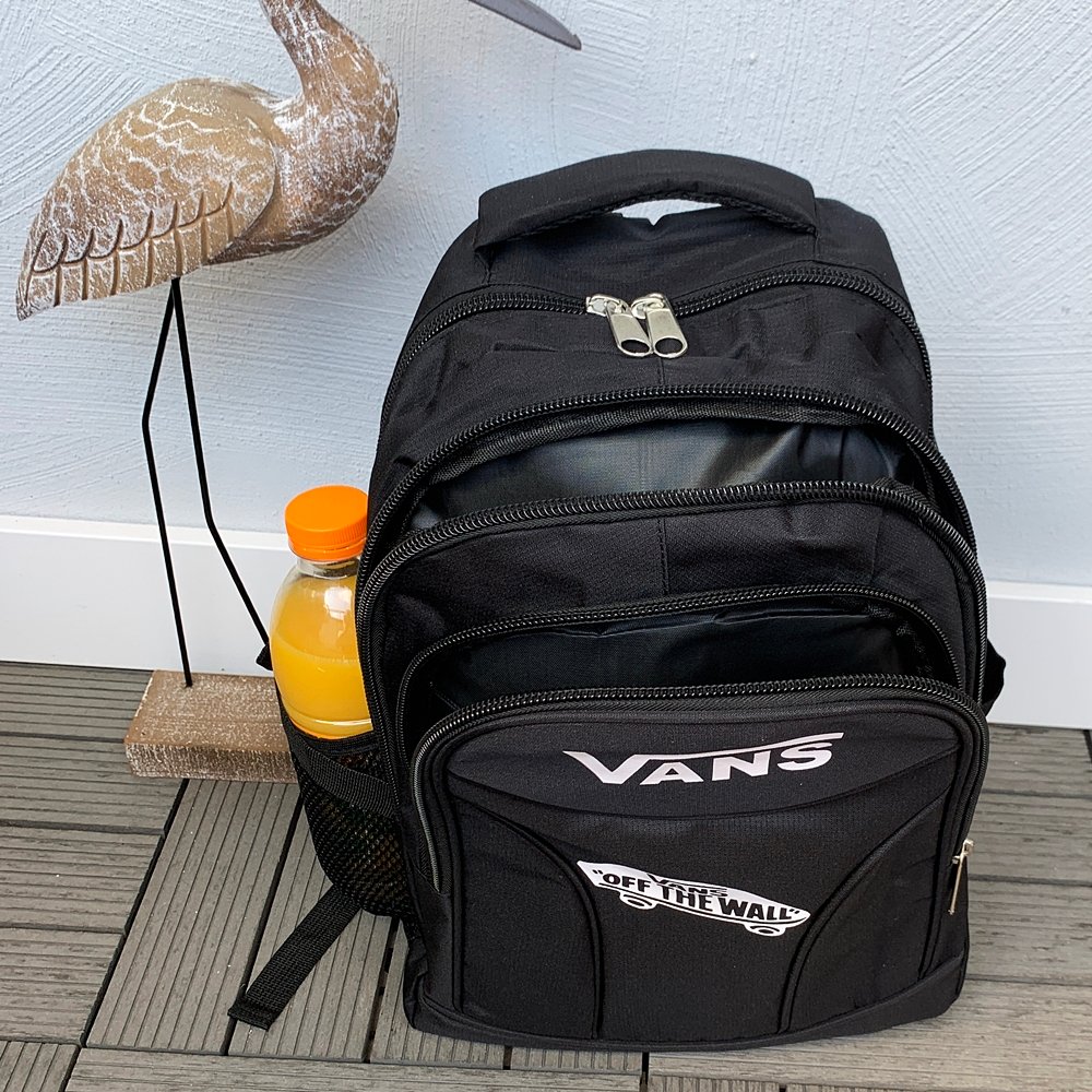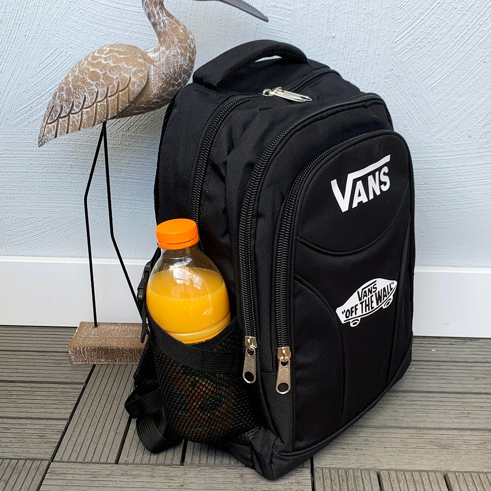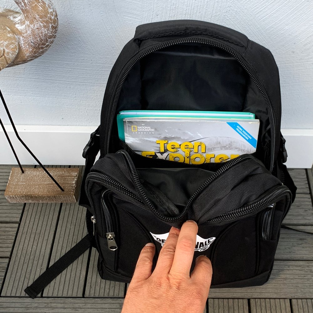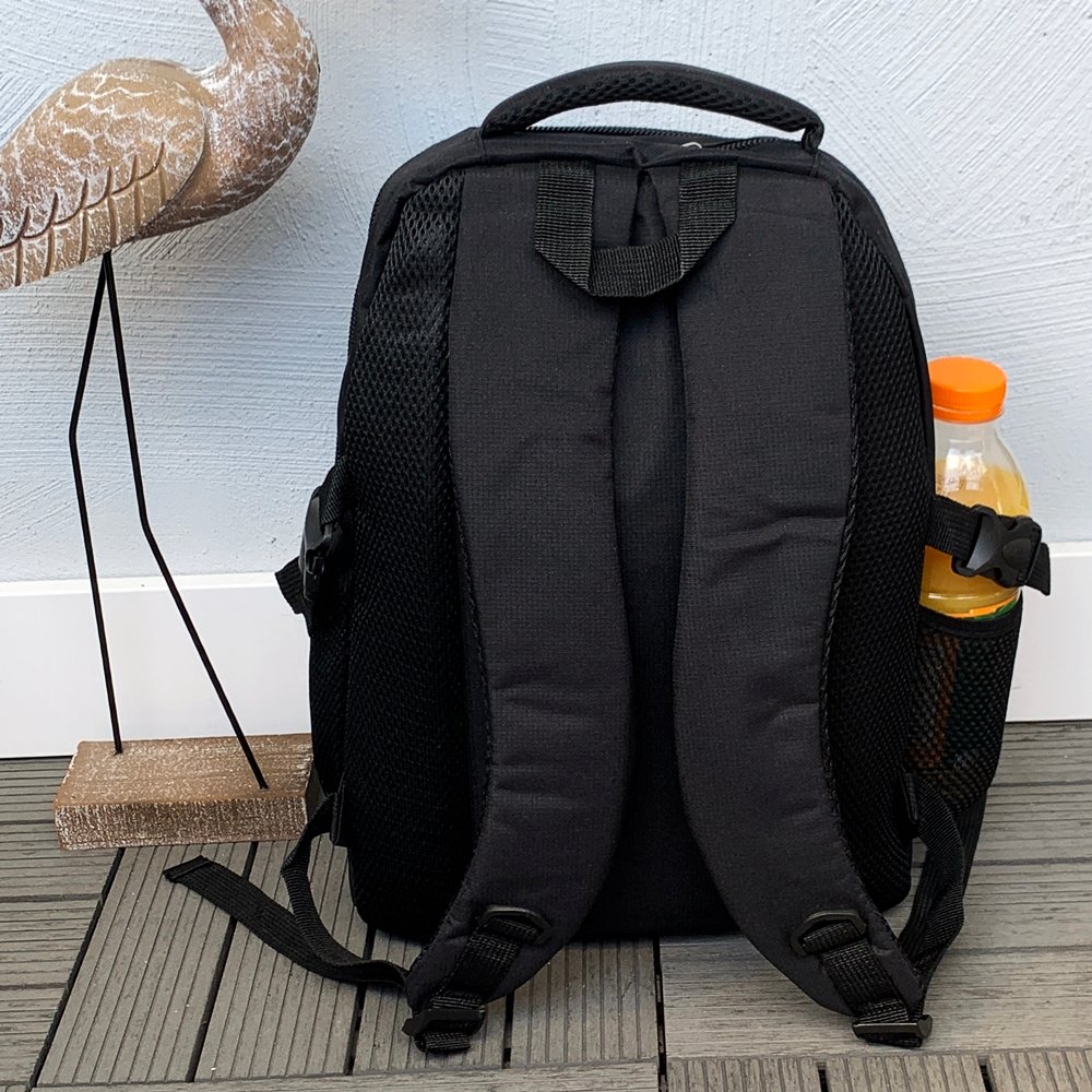 Trzykomorowy plecak unisex z usztywnianymi plecami i kieszeniami na napoje.